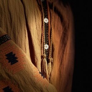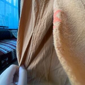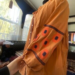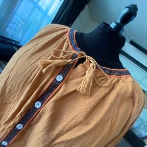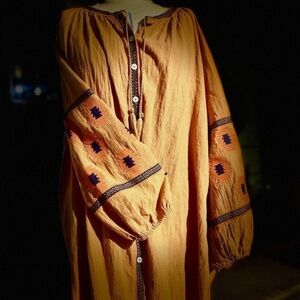 This stylish Umgee tunic top is perfect for any casual occasion. The collarless design and breathable fabric make it comfortable to wear year-round, while the soft crinkle material and embroidered accents add a touch of elegance. The tangerine color and balloon sleeves give it a fun and playful look, making it a great addition to any wardrobe. It features a button closure and is made with a cotton blend that is dry clean only. This blouse is a size L and has a relaxed fit, making it ideal for women who want to feel comfortable and stylish. Put on a belt and it’s transformed for a night out!