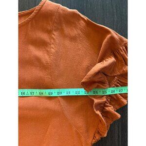 This rust-colored tunic top combines elegant simplicity with a touch of floral design on the back, offering a lightweight and comfortable wear. The ruffle sleeves and high-quality linen blend make it a versatile and stylish choice for casual or semi-formal settings.