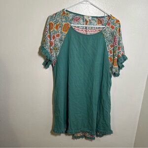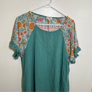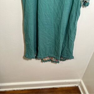 Great condition. Umgee. When Life Gives You Linen Midi Dress. Short sleeve. Scoop neck. Mint green color with mixed media floral print on back and sleeves. Fringe hem. Style A6334. Size small. 55% linen, 45% cotton. Pit to pit laying flat 19” Shoulder to hem 33” Sleeve (seam to hem) 11”. All measurements are approximate and taken laying flat. Smoke free home. No trades, offers welcome.