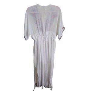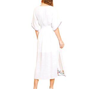 This white floral embroidered midi dress features a smocked waist for a flattering fit. Partial lining. The V-neck and flowy design add a touch of elegance, while the side slit enhances comfort. Perfect for a beach day or casual outing. Retail $58