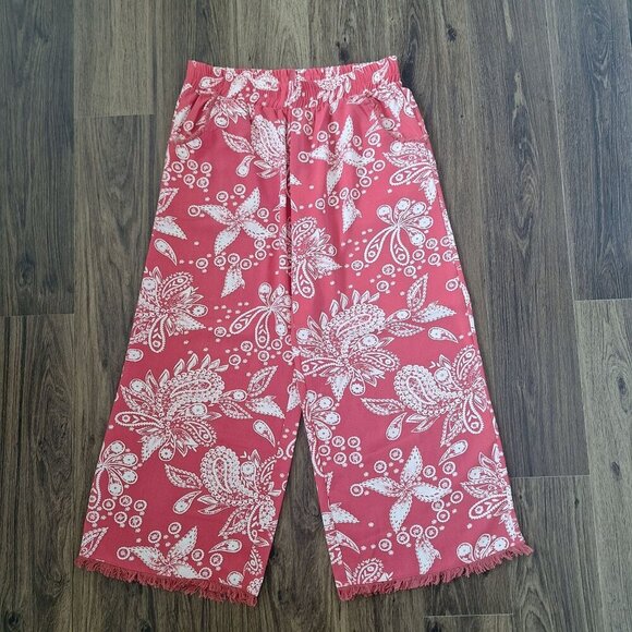 💙 Umgee Wide Leg Flowy Fringe Floral Linen Blend Size L/XL Boho Pants