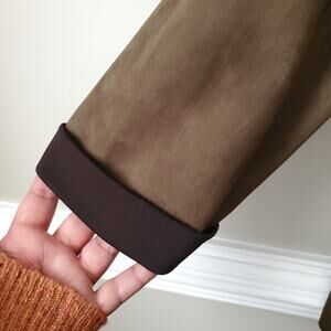 Women's Umgee faux vegan suede open front jacket duster size medium. This is done in a medium olive green with contrasting Floral embroidery. Rolled tacked cuffs.