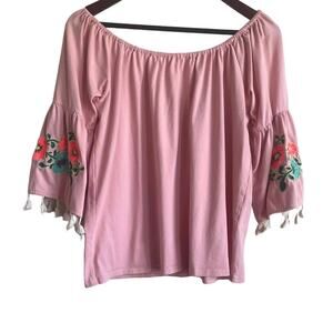 Umgee WomenTop Crew Boat Neck 3/4 Tassel Embroiled Flower Bell Sleeve Boho Pink
