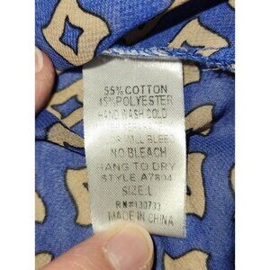 Umgee Womens Geometric Print Blouse L Blue & Beige 3/4 Sleeve Cotton/Polyester