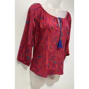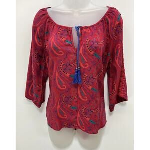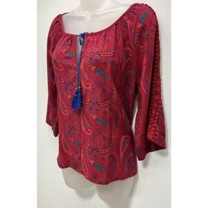 Umgee Women’s Size Medium Multicolor Crotchet Sleeve Tie Neck Paisley Blouse