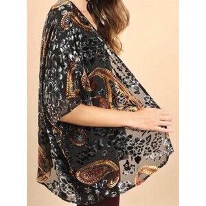 This beautiful Umgee kimono is a must-have for any fashion-forward woman. With a black floral paisley velvet burnout design, 3/4 kimono sleeves, and an open front, this blouse is perfect for any occasion. The relaxed fit makes it comfortable to wear, while the multicolor pattern adds a touch of bohemian flair. Hand wash only. Pre owned in great condition