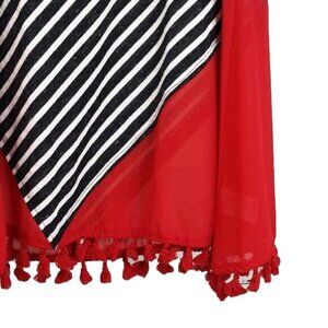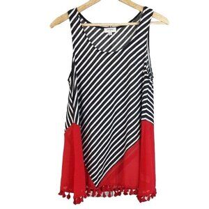 Umgee Womens Striped Tank Top Black & White Small Red Sheer Hem Tassels Scoop