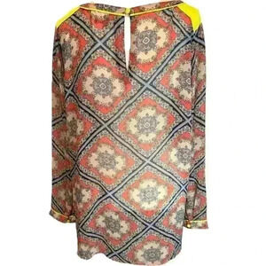 Keywords: Umgee blouse, multicolor tunic, geometric pattern, sheer fabric, high-low hem, casual wear, spring fashion, women's top, long sleeve blouse, keyhole back, round neck, pre-owned.