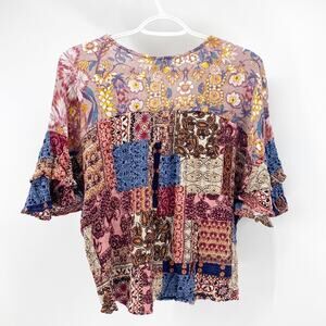 Umgee bohemian faux wrap flutter sleeve hippy cropped mixed media top size L