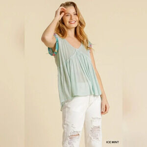 Umgee boho lightweigt mint blue/green mixed media floral patchwork top NWOT