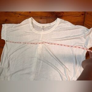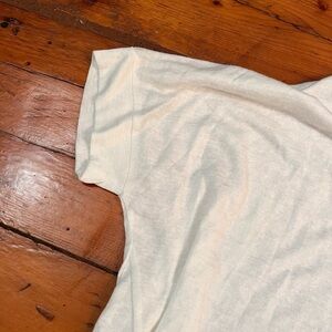 Gorgeous cream off white top in an oversized trapeze swing style. Crochet detail on both sides. Gathering/scoop in back. Short sleeve. Wonderful condition.