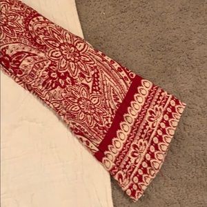 Size M, brand new w/ tags, has a tie in front, along with a button down front as well. Shorts with hippie style long sleeves. Colors are a red/cream color.