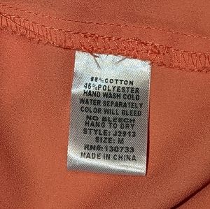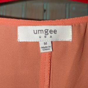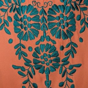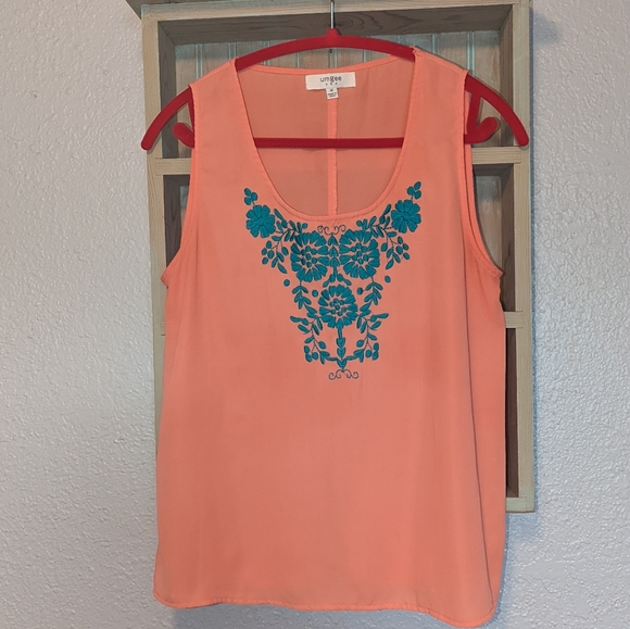 Umgee top Size Medium Coral color with teal embroidery split back