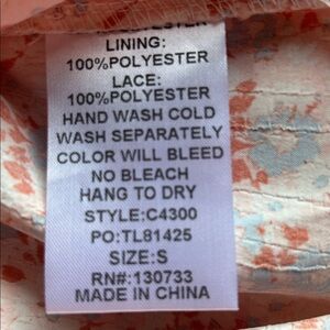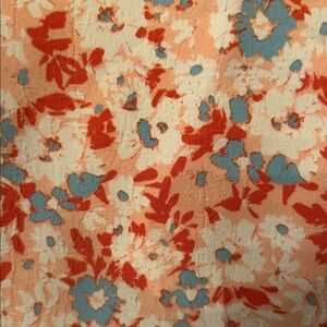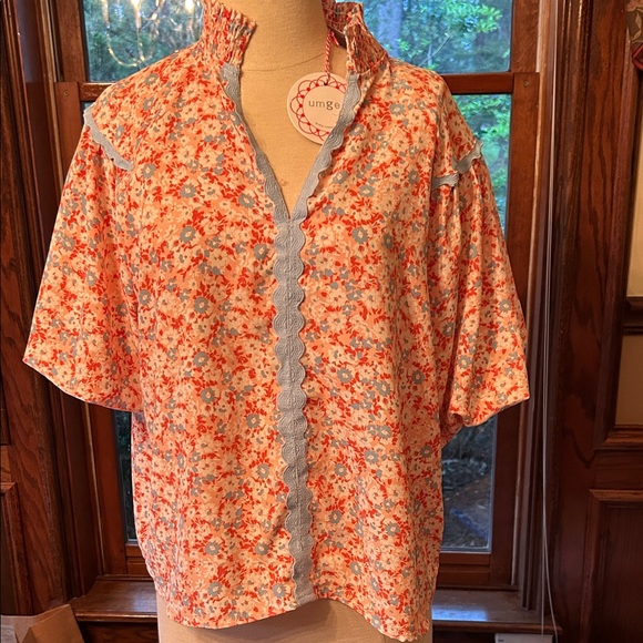 A floral, high neck top by Umgee in peach and lite blue hues trimmed with “rikrak” type blue lace. Size small. 100% Polyester. New with tags.