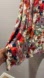 This elegant floral dress features a delicate lace trim, perfect for any occasion. The vibrant red and green hues add a touch of sophistication.