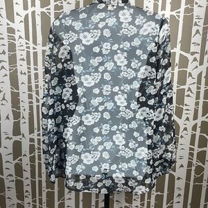 Umgee Black Floral Print Sheer Tie Neck Blouse size S. Features sheer fabric in a base color of black with white, blue & yellow allover floral print, V-Neck with attached neck tie, hi-low hemline, oversized fit, drop style balloon sleeves with elasticized cuffs. Gently worn and laundered with no flaws to note.