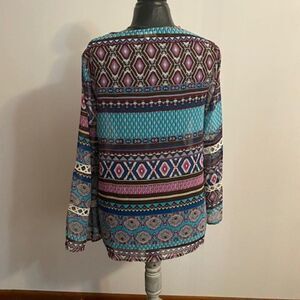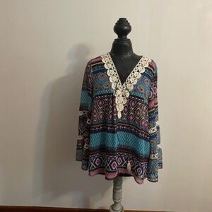 Umgee Blue/Brown/Pink with White Lace V-neck and Lace on sleeves tunic, size M
