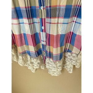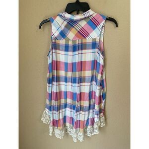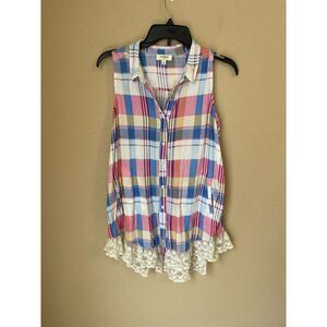 Umgee Button Up Sleeveless Plaid Boho Tunic Blouse Side pockets Pink & Blue Plaid Lace detail Size Small