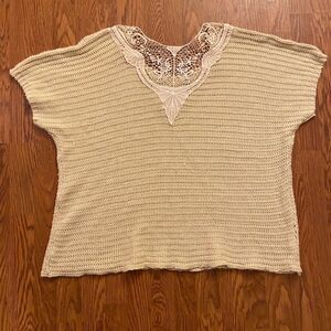 Cream knit pullover sweater poncho with crochet detailing in back. Cute and warm over your favorite long sleeve tee.