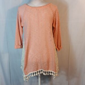 This peach colored with floral lace panels and trimmed with tassels Umgee Tunic sweater is a size Small with a pit to pit measuring 19" and a length of 27". In excellent condition. Offers are welcome.