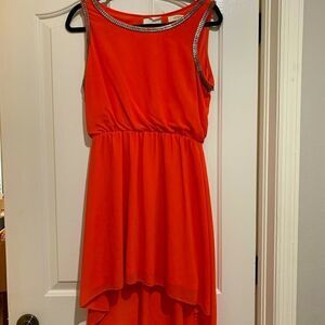 flowy super flattering lined sleeveless orange dress with hi-low hem, elastic waistband and elongated keyhole cutout in the back of the dress. Best detail is the funky metal trim around crew neck neckline and arms.