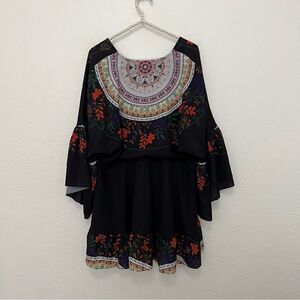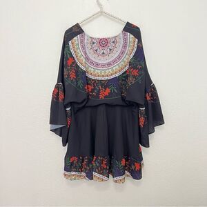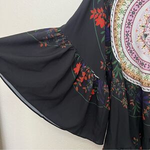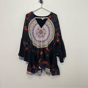 Umgee tunic. Oversized blouse. Medallion medley. Floral print. Large ruffled bell sleeves. High low hem. Boho bohemian. V-neck top. Multi colored. Ruffled hem. Women’s size medium. Offers welcomed.