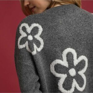 Umgee Round Neck Grey Sweater with Floral Large Flower Print Sz S M