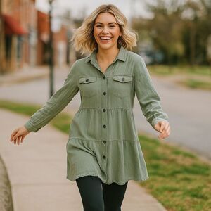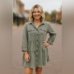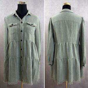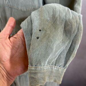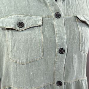 Sage green. Mineral washed fabric. Has 2 button pockets on chest and 2 hip pockets. Frayed bottom hem.