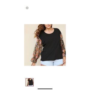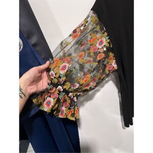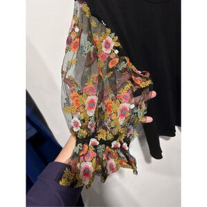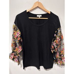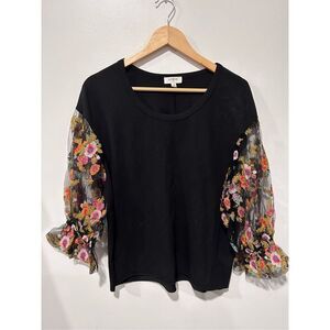 Umgee Sheer Embroidered Floral Balloon Sleeve Black Top Size Small