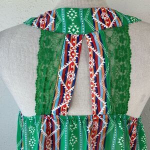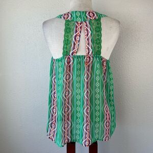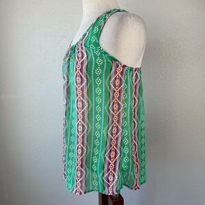 Love the colors and print on this tank top measuring 16 inches armpit to armpit laying flat and 26 inches in length from shoulder to hem.