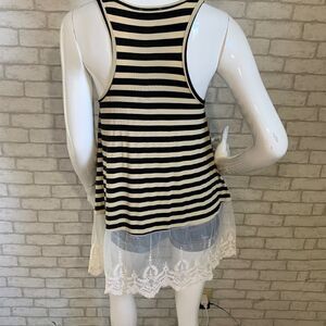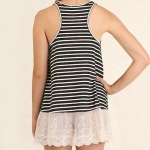 Umgee cream/black striped lace extender. Perfect layering piece! Black and cream stripes, tank style, racer back, delicate cream lace at the bottom. Wear alone or under your favorite sweater. Armpit to armpit measures 17" and length measures 30". In gently used but excellent condition in a women's size small. Tags: layering, extender, tank, racer, boho, bohemian, gypsy, hippie, festival. D-120