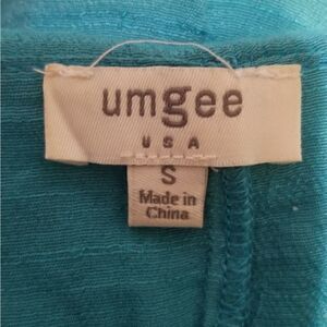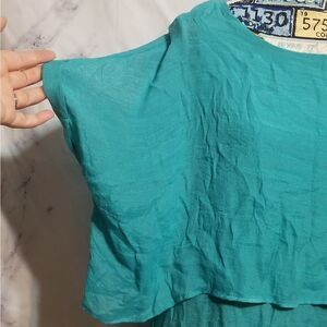 Blue flowing sleeve blouse with over lapping across bust area, size S, 55% rayon 45% polyester, excellent condition.