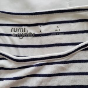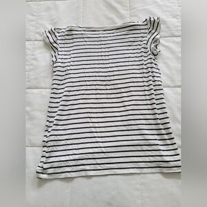 Adorable tee with pink flamingo design. Features classic black stripes. Ideal for casual wear.