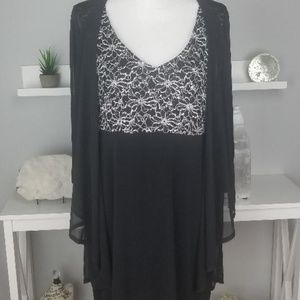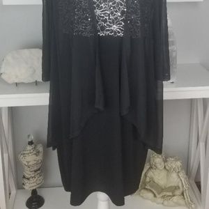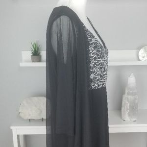This is a brand new Connected Apparel umpire waist scoop neck sheath dress. New with tags, size 12 P. This dress is black with silver sequins and detail and the sheath covering is attached to the dress. This is a long length as seen in photos listed.