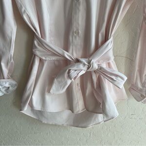 Functional buttons down the front. Tie waist detail. Spread collar. Long sleeves.