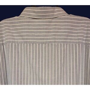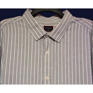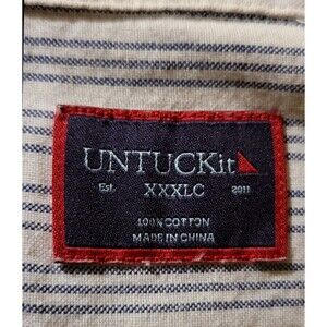 This short sleeve button front shirt is from UnTuckIt in a Mens size XXXLC (3X). It is made from 100% cotton. The tag says its in the style Rutherford, and the style code is 33999. The pit to pit measurement is 61" around. From the top (just to the side of the collar) to the bottom is 32". It is white with blue/gray stripes.