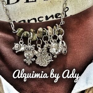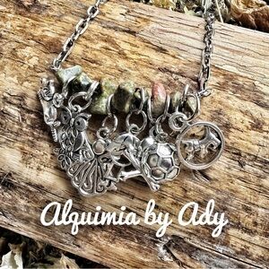 Unakite multi charms chunky silver statement necklace