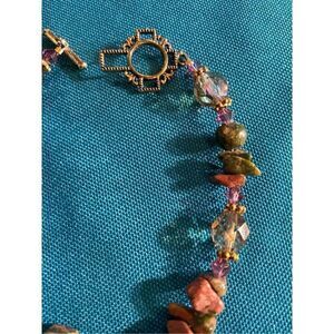 Gorgeous pink and green unakite jasper cross and iridescent beaded bracelet with gold tone toggle clasp. Beautifully handmade genuine Jasper gemstone bracelet that is cute as a bug.