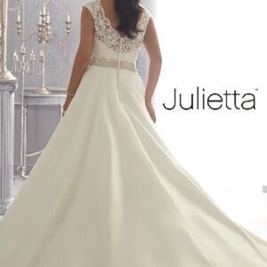 Tried it on fell in love with the idea of it but it just wasn’t the one. It’s not off white like the model more pure white as in my photos. Been in the bag since 2016 unworn, unaltered. Looking for the unique plus size bride willing to give this gorgeous dress a chance to shine!
