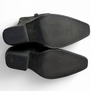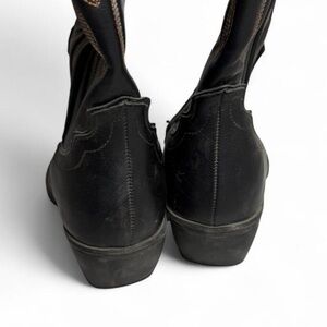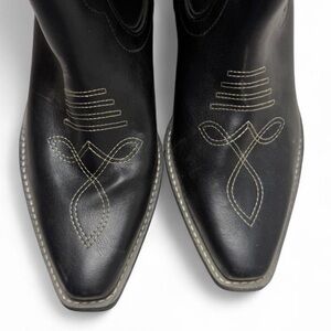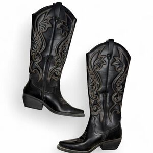 Super cool black western cowgirl boots with tan embroidered stitching and classic western scroll detailing!