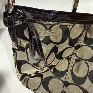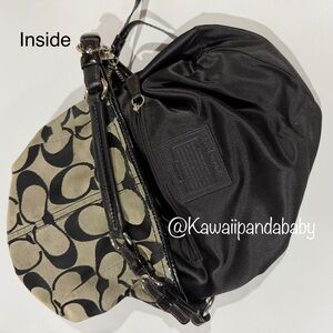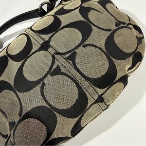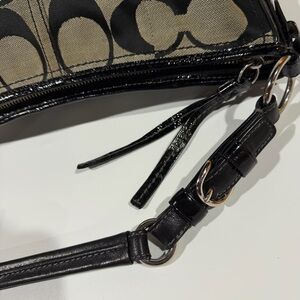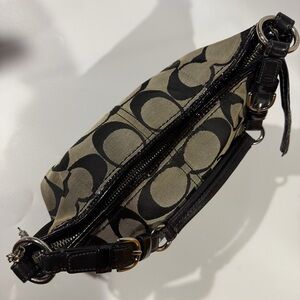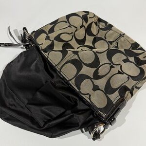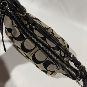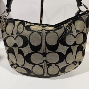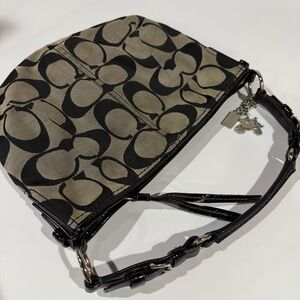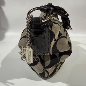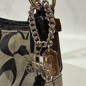 Black monogram logo medium size bag. There’s a silver carriage bag charm attached on the side
