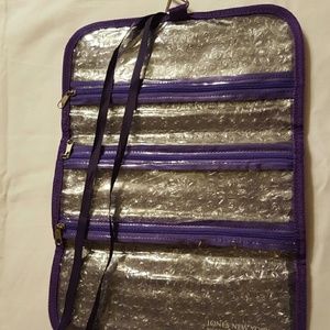 Great for carrying accessories/jewelry in style. Sturdy fabric exterior. Purple background print. Three zipper compartments. Ties with black ribbon for safe keeping. Has hook to provide quicker access. No tears or stains. Like new. 13.5 in. when hanging about 10 in. across.
