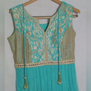 Unbranded Aqua & Gold M Anarkali Women's Net Dress W/ Matching Scarf