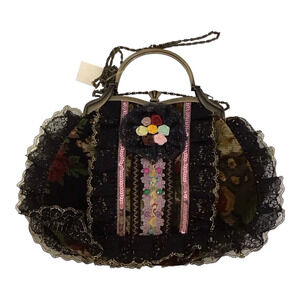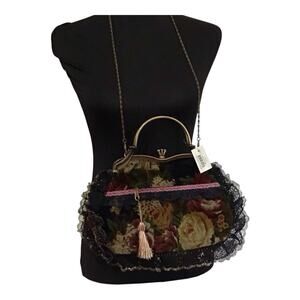 Add a touch of vintage-inspired charm to your collection with this elegant floral crossbody bag. Designed with embroidered floral fabric, delicate lace trim, and a tassel accent, this versatile piece features structured metal handles and a detachable chain strap for crossbody wear.