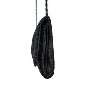 A sleek vintage evening bag with a shimmering black mesh exterior and long chain strap for shoulder or crossbody wear.