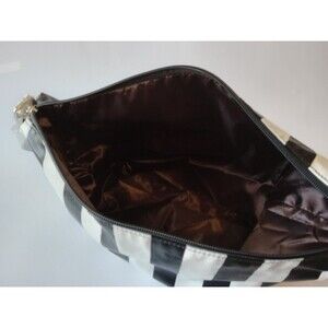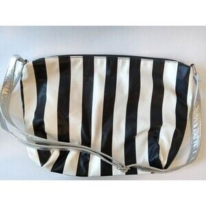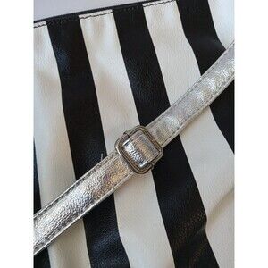 Style: Vertical black and white striped, faux leather bag with silver adjustable strap.