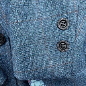 Vintage Unbranded Men's Blazer in size 40, featuring a plaid pattern in blue, green, and red tweed. Adorned with a golden emblem, this 60s-70s sport jacket exudes classic American style.