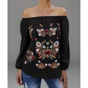 This unbranded peasant blouse in black with embroidery is a stylish and comfortable addition to any woman's wardrobe. Made from a cotton-polyester blend, this blouse features a scoop neckline, 3/4 puff sleeves, and an elastic neck and cuff for a perfect fit. The pullover closure and off-shoulder design add a touch of versatility to the classic peasant style. Perfect for a casual yet chic look, this blouse is suitable for women of sizes M - L.