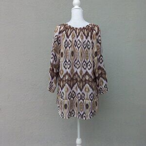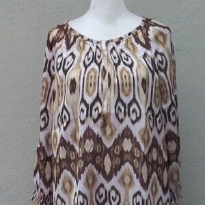 Unbranded Blouse Women's Med Brown Beige White Print Elastic Neckline Preppy
