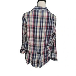 Long Sleeve Button Down Blouse, Also Has Loop & Button to Roll Sleeves, Cuffs have a Button & Hole, 2 Front Pockets with Buttons, 98% Cotton 2% Spandex, Armpit to Armpit 22in Sleeve Length 25in Length 27in